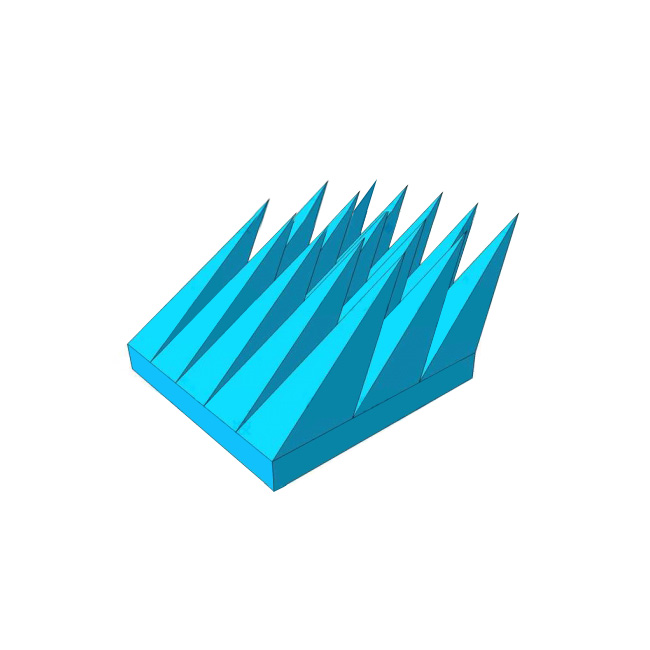 SAX泡沫斜角锥吸波材料通过改变角锥的方向,同时锥顶夹角为30°,从而相对减小入射的角度,提高大角度斜入射的高频反射性能,低频改善不明显。适用于波长远小于锥间距的情况。
