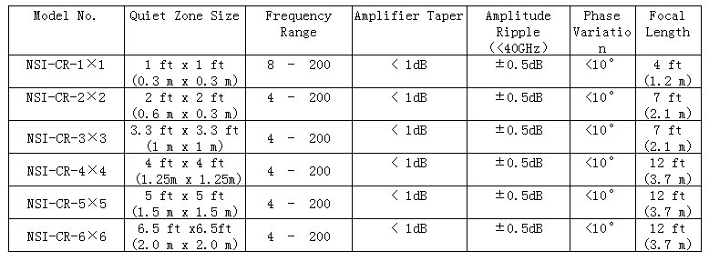 雅驰实业提供一系列紧缩场天线测量锯齿边反射面,静区范围(从304.8*304.8mm2到1981.2*1981.2mm2)。这些反射面可以覆盖从2GHz~200GHz的紧缩场测量,具体型号根据测量需求选择。
