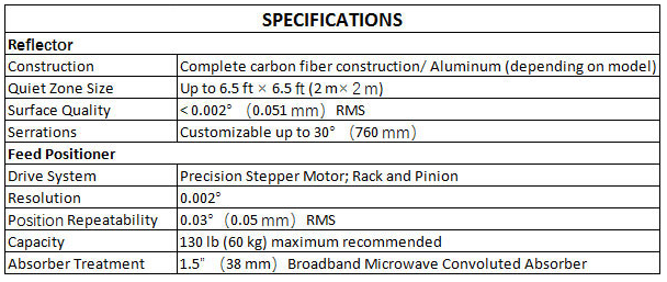 这些反射面的面精度RMS<0.051mm。反射面有较大的静区尺寸(4~6英尺),在暗室这个完全碳纤维结构的环境下,能够显著改善暗室的不稳定热量的耐受性。锯齿端可以根据特定的测试应用定制。