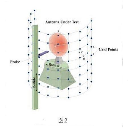 柱面扫描法的安装:柱面测量系统中,待测天线位于方位转台之上,其口径面边缘垂直于地面,探头沿垂直方向上进行扫描,位于方位转台之上的待测天线沿圆周运动。转动带测天线,垂直方向上扫描一次,一周之后,可完成整个柱面的扫描系统,如图二所示,二者的组合运动在柱面上形成了相互关联的采样格点。