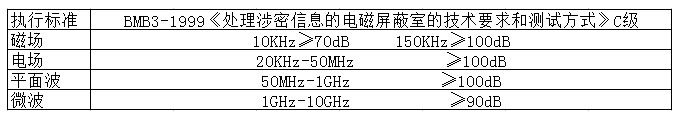 《处理涉密信息的电磁屏蔽室的技术要求和测试方法》BMB3-1999,该标准将屏蔽室分为C级、B级,C级屏蔽室屏蔽效能高。