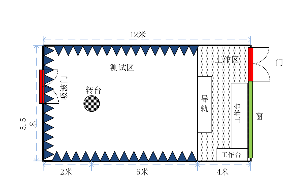2.暗室外尺寸:8m(L)×5.5m(W)×3.6m(H);(测试区五面墙体安装吸波材料);