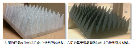 他们的低反射系数部分是由于其锥体形状所实现,这种形状使其能够在空气和吸收体之间逐渐过渡阻抗。其次它的质量轻也使其容易在暗室中安装。大量的气泡也导致实际的介电常数(ε‘)的低点,这就阻止了高水平的反射。然而聚氨酯泡沫的柔性几乎不允许其通过复杂形状增强吸收。用于浸渍泡沫的方法也导致导电颗粒的不均匀分配。此外,纳米粒子的使用目前尚不明确:这些挥发性粉尘颗粒可能对人体健康有害。
